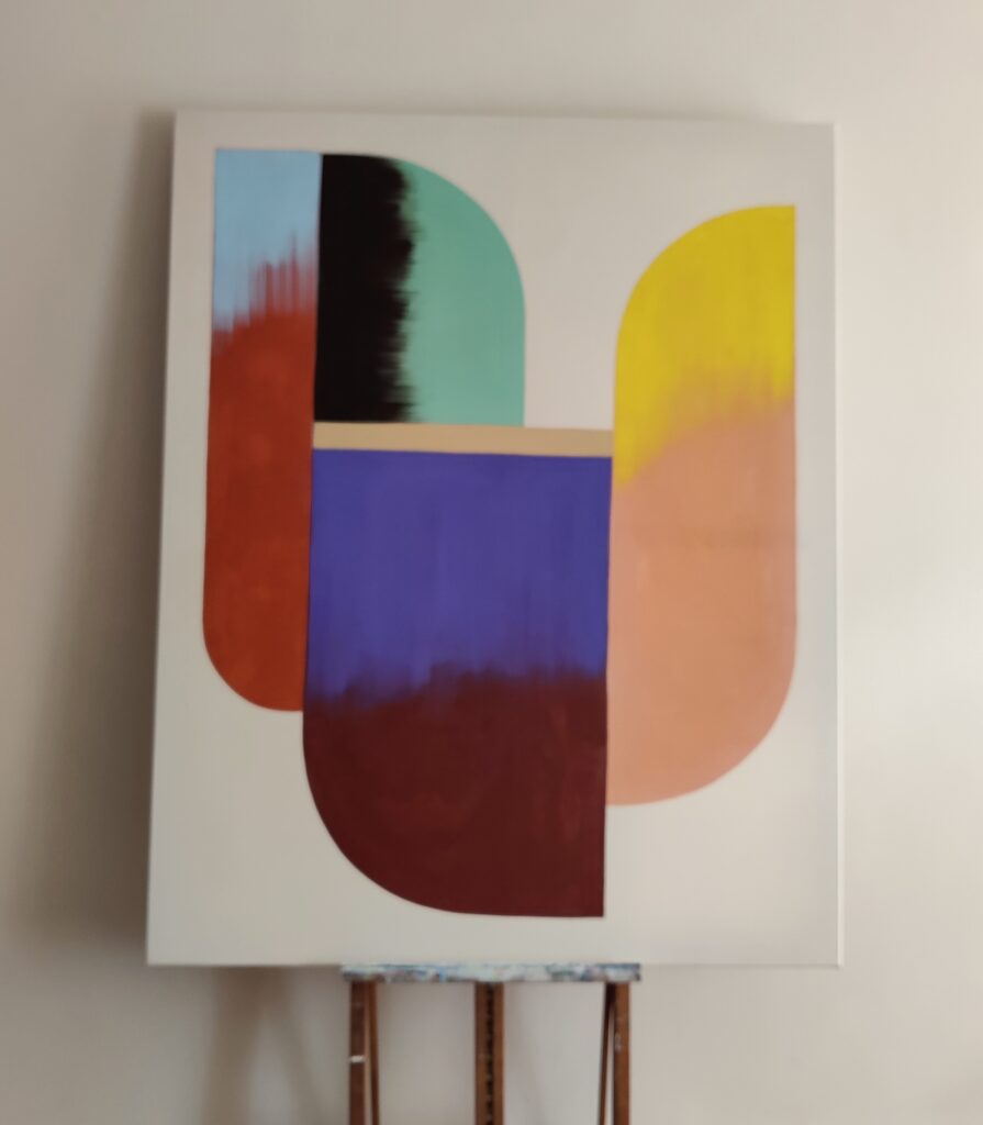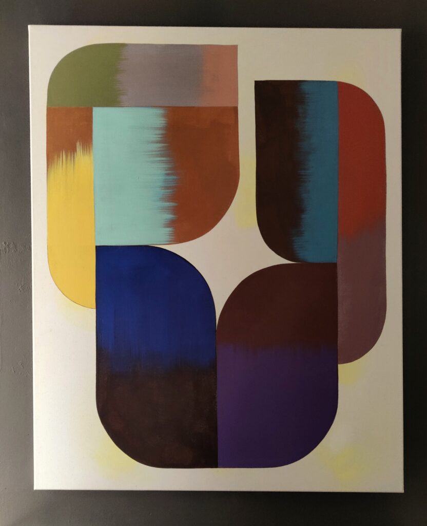 Ik hou van ritme en ordening in mijn werk en ik speel met de ruimte tussen de vormen. Mijn kleurgebruik is heel intuïtief. Ik schilder veel lagen over elkaar om diepte en intensiteit in de kleuren te krijgen.